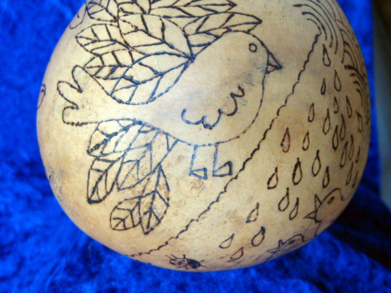 I've been working on 2 gourd fairy (faery) houses. One is further along than the other. I did a lot of wood burning on the first one yesterday. In hindsight it's probably better to do the pyrography first and then glue the decorations on so I don't knock them loose as I spin the gourd around to add the graphics. After woodburning my hair always smells like fireplace smoke. I need to get some moss for the interior and figure out how to make furniture. Maybe a table and chair for the inside, and a little woven rug.